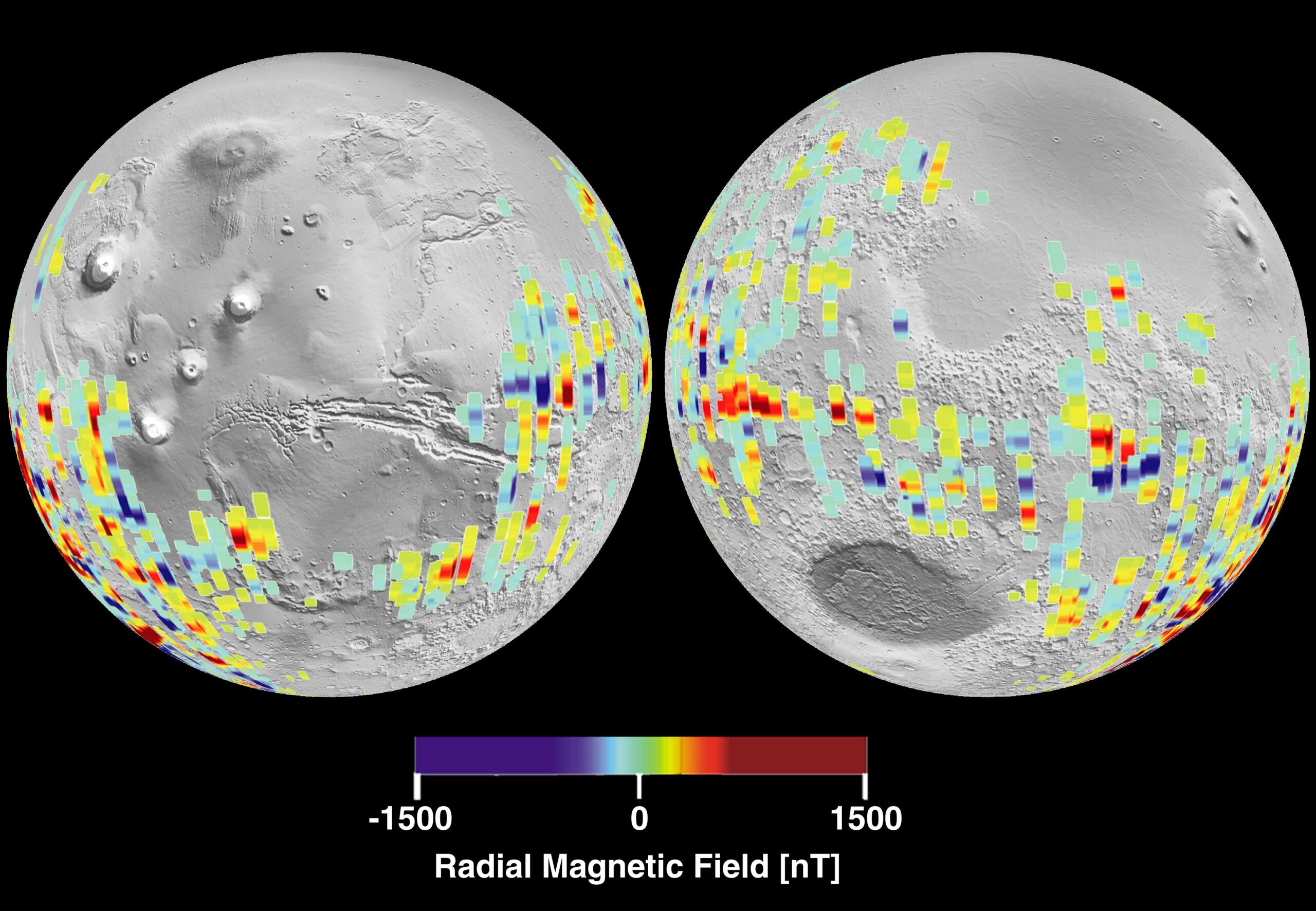 Quizás la consecuencia más importante de este estudio es su relación con el campo magnético… o más bien con su ausencia. Hay zonas de la corteza marciana que están fuertemente magnetizadas, como un fósil que nos indica que Marte tuvo en algún momento un fuerte campo magnético, como hoy el de nuestro planeta.