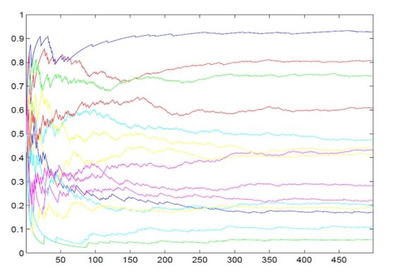 La anterior imagen nos muestra un gráfico en el que se representa la evolución en cada simulación de la proporción de bolas rojas respecto del total de bolas, rojas y azules, al realizar quince simulaciones, con un total de 500 extracciones cada una, del experimento de la urna de Polya, en el caso en el que se favorable “al que menos tiene”.