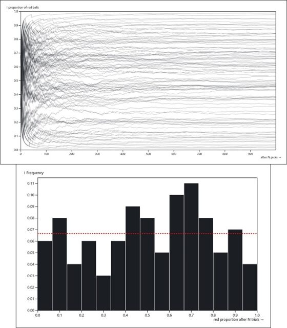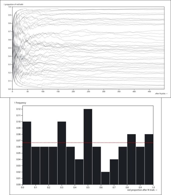Si estáis interesados en realizar vuestras propias simulaciones del modelo de la urna de Polya y no queréis programarlo vosotros mismos, tenéis algunas opciones. Por ejemplo, en la siguiente página de Charlie Moog sobre la urna de Polya (pincha aquí), podéis plantear la realización de entre 1 y 100 simulaciones distintas, con cantidad de extracciones entre 1 y 1.000, y se generará la representación gráfica instantánea de todas ellas. Además, le acompaña un gráfico de barras para conocer cuántas de esas simulaciones han tenido proporciones de bolas de un cierto color (p.e. rojas) entre 0 y 0,1; entre 0,1 y 0,2; entre 0,2 y 0,3; así hasta entre 0,9 y 1, para entender mejor que todas las opciones entre 0 y 1 son posibles, e igualmente probables.