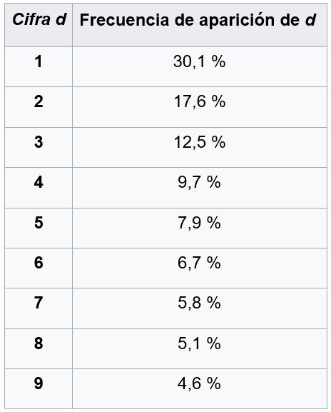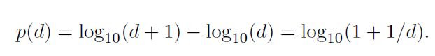 La ley de Benford establece que la probabilidad de que un número obtenido de un determinado dato comience con el dígito d es de: