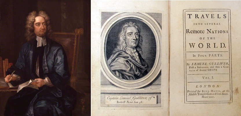 Retrato de Jonathan Swift, por Charles Jervas (National Portrait Gallery, Londres), y portada de la primera edición de Los viajes de Gulliver (1726). La obra se publicó un año antes del fallecimiento de Isaac Newton. Fuente: Dominio público.