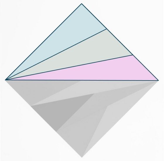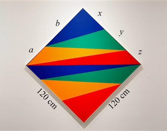 En esta entrada vamos a centrarnos en una serie de obras de este artista concreto que consisten en rombos con ángulo interior recto, es decir, cuadrados girados con un vértice hacia arriba y otro hacia abajo, que están divididos en diferentes triángulos, como la pintura que mostramos más abajo. Más aún, vamos a reflexionar sobre el área de algunos de esos triángulos, cuestión fundamental en el proceso creativo de las mismas, como podemos apreciar por el título de la siguiente obra, Unidad de colores con la misma superficie (1972), que fue expuesta en la Fundación Juan March dentro de la exposición Max Bill (2015).