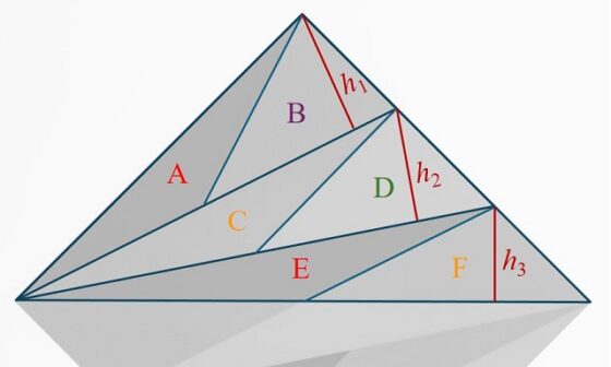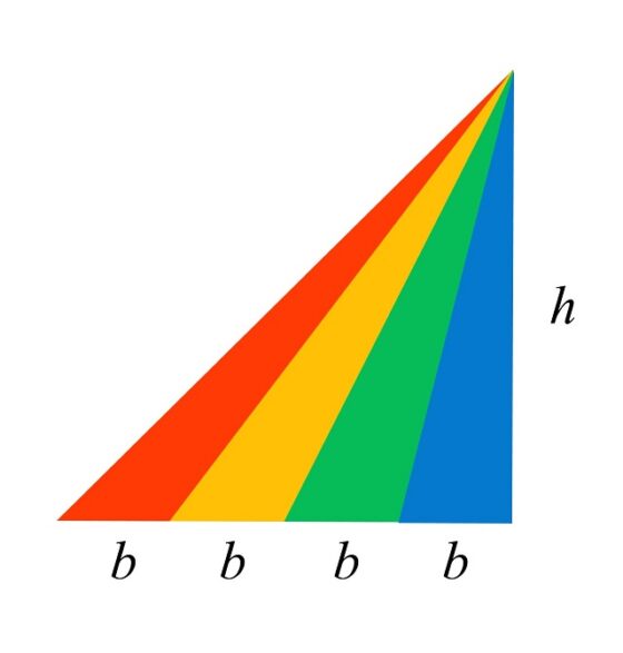 Así, el triángulo de arriba del todo (azul claro) se divide en los triángulos A y B, como se muestra en la siguiente imagen, dos triángulos que tienen sus bases de la misma longitud y que comparten la altura h1, por lo tanto, al calcular “base por altura partido por dos” se obtiene el mismo resultado. Lo mismo ocurre para los otros dos triángulos (verde y morado claros).