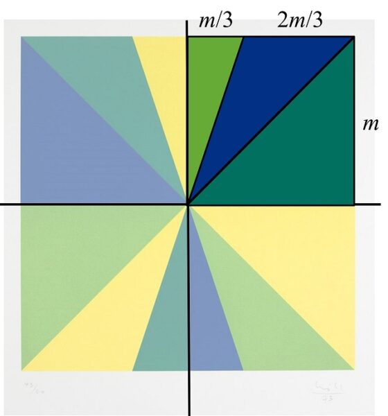 Analicemos, a continuación, la obra de Max Bill titulada Unidad de colores con la misma superficie (1972), con la que empezábamos esta entrada. En esta ocasión, vamos a darle la vuelta al análisis y vamos a plantearlo como un reto matemático.