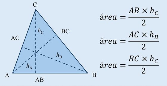 Una cuestión para tener en cuenta es que la base del triángulo puede ser cualquiera de sus tres lados, cada uno de los cuales tendrá asociada una altura diferente, de lo que se desprende que se tienen tres expresiones distintas, auque emanan de la misma fórmula, que proporcionan el área del triángulo. En la siguiente imagen se muestran las tres expresiones para un triángulo ABC.