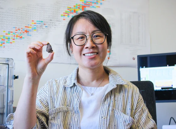 Para comprobar la validez de esta historia, los investigadores necesitan mirar hacia atrás en el tiempo, hasta los primeros momentos del sistema solar e incluso antes. Y la cosmoquímica Nan Liu tiene una forma de hacerlo: guardado en una caja fuerte de su despacho en el Instituto de Investigación Astrofísica de la Universidad de Boston hay un fragmento de meteorito salpicado de material más antiguo que el Sol.