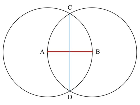 Veamos la construcción paso a paso. Empezamos por la vesica piscis, generada por dos circunferencias de manera que el centro de cada una de ellas está en la otra circunferencia. El primero de los lados del pentágono es el segmento que une los dos centros, llamados A y B en la siguiente imagen. Y se considera también el segmento que une los puntos de intersección de las circunferencias, C y D en la imagen, que es la mediana del segmento AB, es decir, pasa por su punto medio.