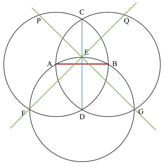 A continuación, se traza la circunferencia de centro uno de los dos puntos de intersección de las dos circunferencias, por ejemplo, el que está abajo, D, y se marcan los puntos de intersección de esta circunferencia con el segmento CD (llamamos E a ese punto), así como con las otras dos circunferencias (llamamos a esos puntos F y G). Entonces, se trazan dos rectas, una que pasa por los puntos E y F, y la otra por los puntos E y G, que dan otros dos puntos especiales, los cortes de esas rectas con las dos circunferencias iniciales, que denotamos P y Q.