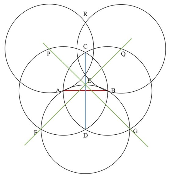 Ahora, trazamos otras dos circunferencias, del mismo radio que las anteriores, centradas en los puntos P y Q, que se intersecarán en un nuevo punto R.