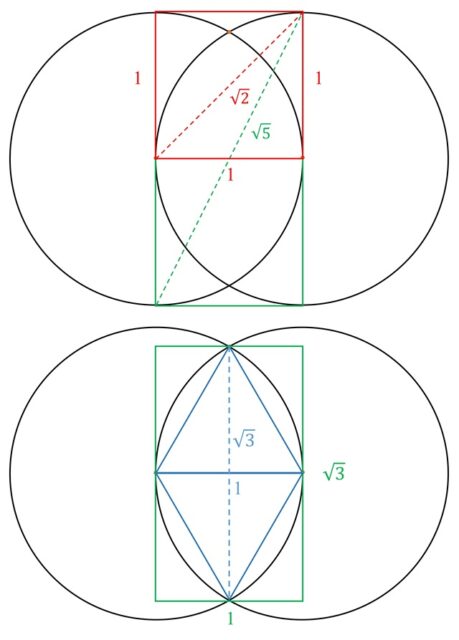 En la entrada Las proporciones de la vesica piscis vimos que se podían asociar algunas proporciones irracionales, como las raíces cuadradas de 2, 3 o 5, a la vesica piscis, así como la razón áurea. En la siguiente imagen mostramos los segmentos de longitudes la raíz cuadrada de 2, 3 o 5, si la distancia entre los centros de las circunferencias es la unidad (1).