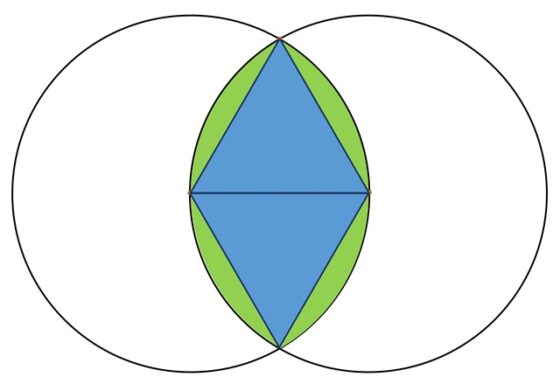 Ahora que estamos fijando nuestra atención en aspectos geométricos de esta figura, podemos pensar en cual es el valor del área de la misma, que no es difícil de calcular. Para ello solo necesitamos tener en cuenta que la vesica piscis se compone de dos triángulos equiláteros iguales (azules en la siguiente imagen) y cuatro segmentos circulares iguales (verdes en la siguiente imagen). Luego el área de la vesica piscis es igual a la suma de las áreas de estas seis regiones geométricas.