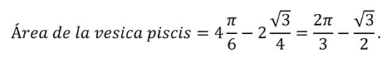 Con esta información, solo tenemos que darnos cuenta de que la superficie de la vesica piscis es igual a la superficie de cuatro sectores circulares, así aseguramos que cubrimos los cuatro segmentos circulares, menos la superficie de dos triángulos equiláteros, ya que al contar los cuatro sectores circulares, estamos considerando cuatro triángulos equiláteros y la vesica piscis solo está compuesta por dos. En consecuencia,
