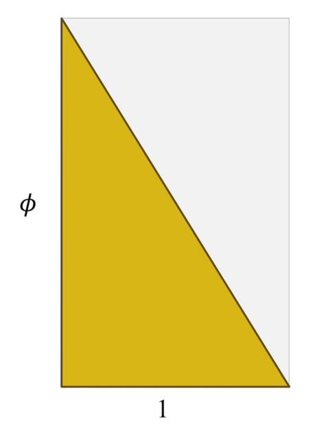 El primer triángulo áureo del que vamos a hablar es el más obvio, ya que es la mitad de un rectángulo áureo. En la entrada titulada ECHO, un cómic áureo, ya explicamos que un rectángulo es áureo si la proporción a/b entre su alto, a, y su ancho, b, es precisamente la divina proporción ϕ (Phi) = 1,618…