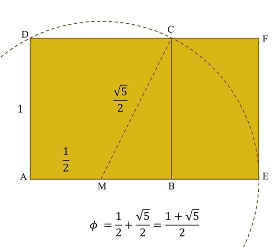 El rectángulo áureo se puede construir fácilmente a partir de un cuadrado. Dado un cuadrado (en la imagen el cuadrado ABCD), que podemos considerar de lado 1, es fácil ver, por el teorema de Pitágoras, que el segmento que va desde el punto M que está en la mitad de uno de los lados (el de abajo, AB, en la imagen) a uno de los vértices del lado opuesto (el de arriba a la derecha, C, en la imagen) tiene longitud igual a raíz cuadrada de 5 dividido 2 (√5/2). Si ahora trazamos el arco de circunferencia centrado en M y de radio esa longitud, es decir, que pasa por el punto C, y llamamos E al punto de intersección de la circunferencia con la recta que extiende el segmento AB, entonces el rectángulo creado AEFD es un rectángulo áureo, puesto que el largo es Phi [1/2 + √5/2 = (1 + √5)/2] y el ancho es 1, luego tiene proporción áurea.