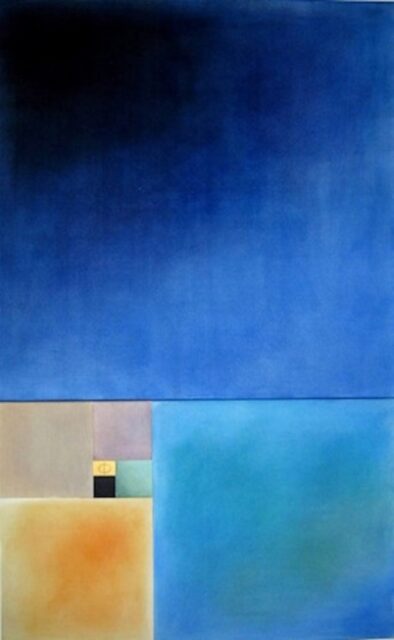 Phi, de la artista concreta alemana Irene Schramm-Biermann, sobre la descomposición de un rectángulo áureo en un cuadrado y un rectángulo áureo más pequeño, que a su vez puede descomponerse, y así hasta el infinito. Imagen de su página web: Irene Schramm-Biermann